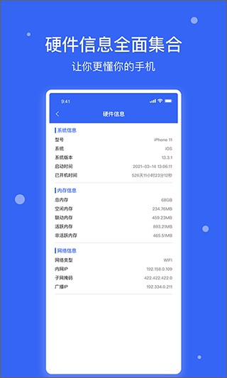 3、硬件信息全维度展示,系统、内存、网络、电池等信息详细呈现,让用户全面掌握手机状态。