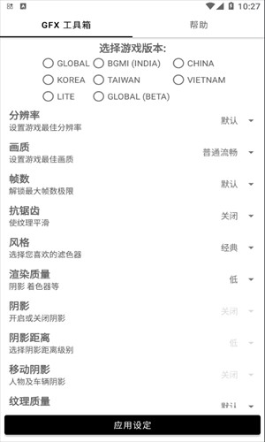 2、如图,当工具箱主界面上方游戏版本栏消失的时候,说明已经选择好游戏版本了,接下来设置好分辨率、画质、帧数等选项后点击下方【应用设定】即可保存设置,