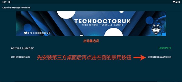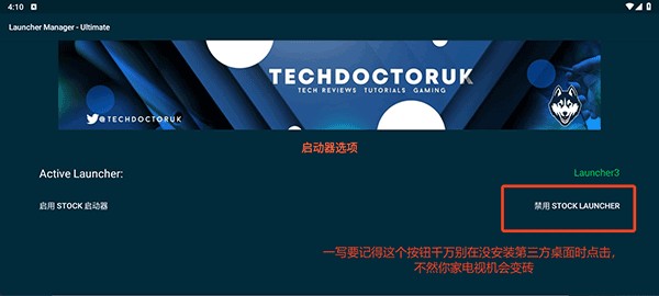 如果你的电视或机顶盒没有安装第三方桌面app,那千万别点击右下角那个“DISABLE STOCK LAUNCHER”按钮,否则开不了机而可能变砖,后果自负。