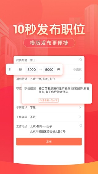 58同城招聘商家版是一款在基层和大众人才招聘领域极具竞争力的利器,特别适合餐饮、零售、物流、制造、地产中介等需要大量招募一线员工的企业。如果您核心的招聘需求是快速填补基础岗位空缺,那么这款APP凭借其庞大的简历库和高效的招聘工具。
