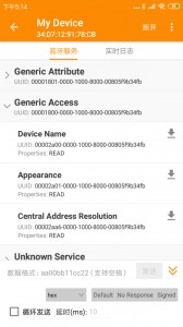 3、蓝牙连上之后,可以看到一共四个蓝牙服务,Generic Access、Generic Attribute以及两个Unknown Service;